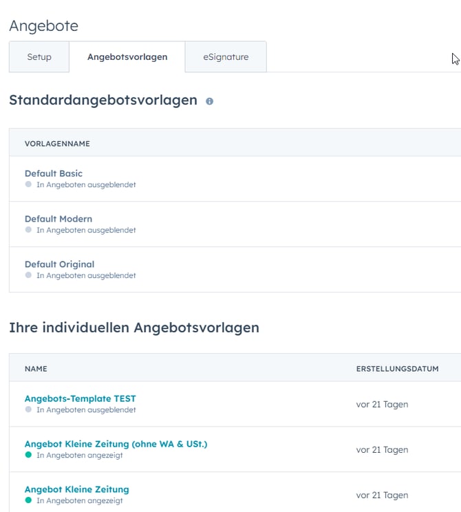 Zugriff aufs Angebottemplate über zwei Orte: Content > Design-Manager oder Einstellungen > Objekte > Angebote > Angebotsvorlagen (hier können die Templates auch ein- und ausgeschaltet werden)